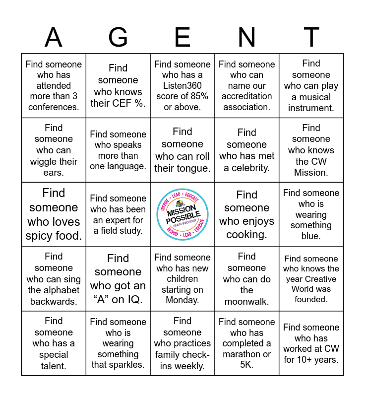 This bingo card has a free space and 24 words: Find someone who got an “A” on IQ., Find someone who is wearing something that sparkles., Find someone who can roll their tongue., Find someone who has a special talent., Find someone who can play a musical instrument., Find someone who has attended more than 3 conferences., Find someone who can wiggle their ears., Find someone who knows their CEF %., Find someone who enjoys cooking., Find someone who has new children starting on Monday., Find someone who has met a celebrity., Find someone who loves spicy food., Find someone who can do the moonwalk., Find someone who knows the year Creative World was founded., Find someone who speaks more than one language., Find someone who has completed a marathon or 5K., Find someone who is wearing something blue., Find someone who has a Listen360 score of 85% or above., Find someone who knows the CW Mission., Find someone who has been an expert for a field study., Find someone who has worked at CW for 10+ years., Find someone who can sing the alphabet backwards., Find someone who can name our accreditation association. and Find someone who practices family check-ins weekly..