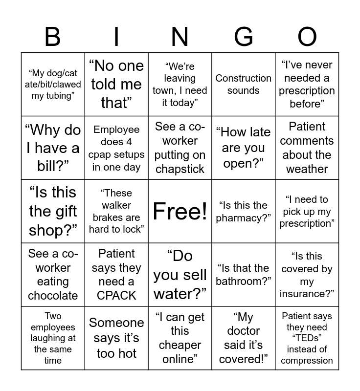 This bingo card has a free space and 24 words: Patient says they need a CPACK, Someone says it’s too hot, See a co-worker putting on chapstick, Two employees laughing at the same time, “I’ve never needed a prescription before”, “My dog/cat ate/bit/clawed my tubing”, “Why do I have a bill?”, “No one told me that”, “Is this the pharmacy?”, “Do you sell water?”, “How late are you open?”, “Is this the gift shop?”, “Is that the bathroom?”, “Is this covered by my insurance?”, Employee does 4 cpap setups in one day, “My doctor said it’s covered!”, “I need to pick up my prescription”, “We’re leaving town, I need it today”, Patient comments about the weather, “These walker brakes are hard to lock”, Patient says they need “TEDs” instead of compression, See a co-worker eating chocolate, Construction sounds and “I can get this cheaper online”.