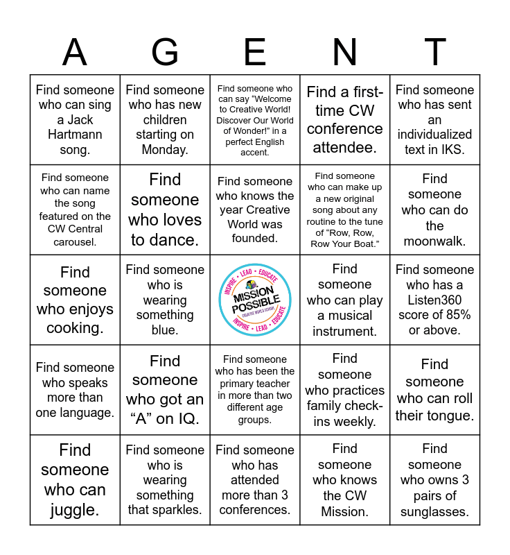 This bingo card has a free space and 24 words: Find someone who got an “A” on IQ., Find someone who is wearing something that sparkles., Find someone who knows the year Creative World was founded., Find someone who can juggle., Find someone who has sent an individualized text in IKS., Find someone who can sing a Jack Hartmann song., Find someone who can name the song featured on the CW Central carousel., Find someone who has new children starting on Monday., Find someone who can play a musical instrument., Find someone who has been the primary teacher in more than two different age groups., Find someone who can make up a new original song about any routine to the tune of “Row, Row, Row Your Boat.”, Find someone who enjoys cooking., Find someone who practices family check-ins weekly., Find someone who can roll their tongue., Find someone who loves to dance., Find someone who knows the CW Mission., Find someone who has a Listen360 score of 85% or above., Find someone who can say “Welcome to Creative World! Discover Our World of Wonder!” in a perfect English accent., Find someone who can do the moonwalk., Find someone who is wearing something blue., Find someone who owns 3 pairs of sunglasses., Find someone who speaks more than one language., Find a first-time CW conference attendee. and Find someone who has attended more than 3 conferences..