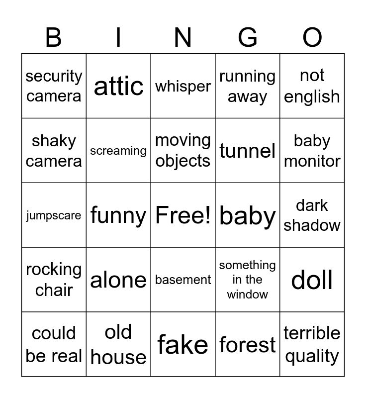 This bingo card has a free space and 24 words: alone, old house, moving objects, could be real, not english, security camera, shaky camera, attic, baby, basement, tunnel, jumpscare, something in the window, doll, screaming, forest, dark shadow, whisper, baby monitor, funny, terrible quality, rocking chair, running away and fake.