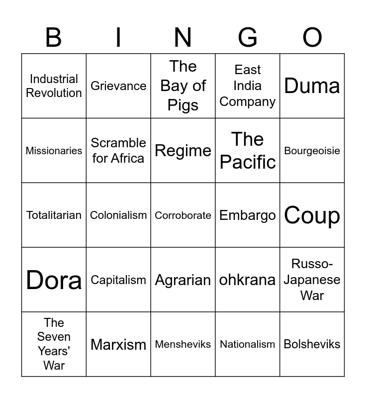 This bingo card has a free space and 24 words: Capitalism, Marxism, Regime, The Seven Years' War, Duma, Industrial Revolution, Missionaries, Grievance, Embargo, Agrarian, The Pacific, Totalitarian, ohkrana, Russo-Japanese War, Scramble for Africa, Nationalism, Coup, The Bay of Pigs, Bourgeoisie, Colonialism, Bolsheviks, Dora, East India Company and Mensheviks.
