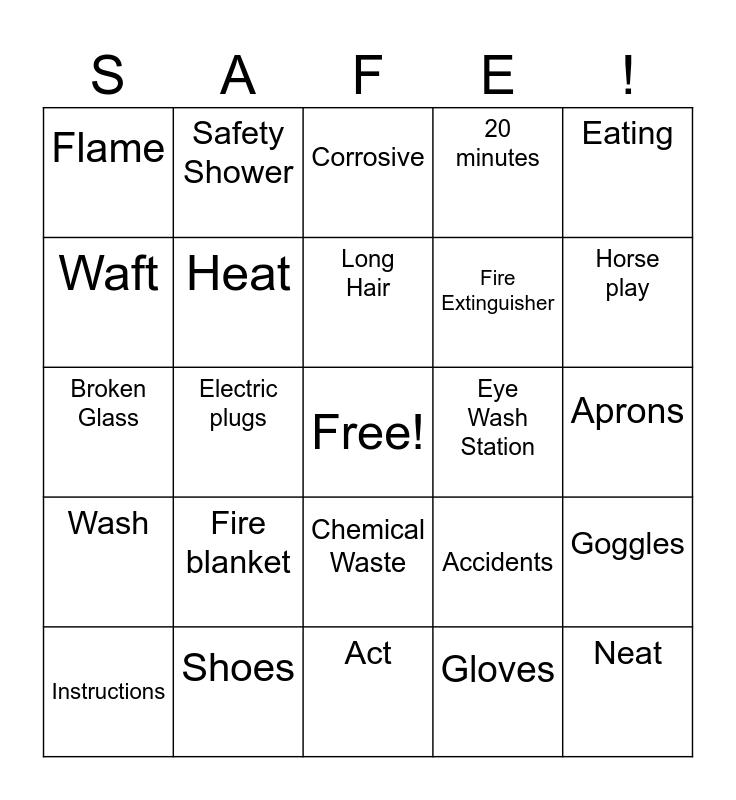 This bingo card has a free space and 24 words: Fire blanket, Shoes, Long Hair, Instructions, Eating, Flame, Waft, Safety Shower, Eye Wash Station, Chemical Waste, Fire Extinguisher, Broken Glass, Accidents, Goggles, Heat, Gloves, Aprons, Corrosive, Horse play, Electric plugs, Neat, Wash, 20 minutes and Act.