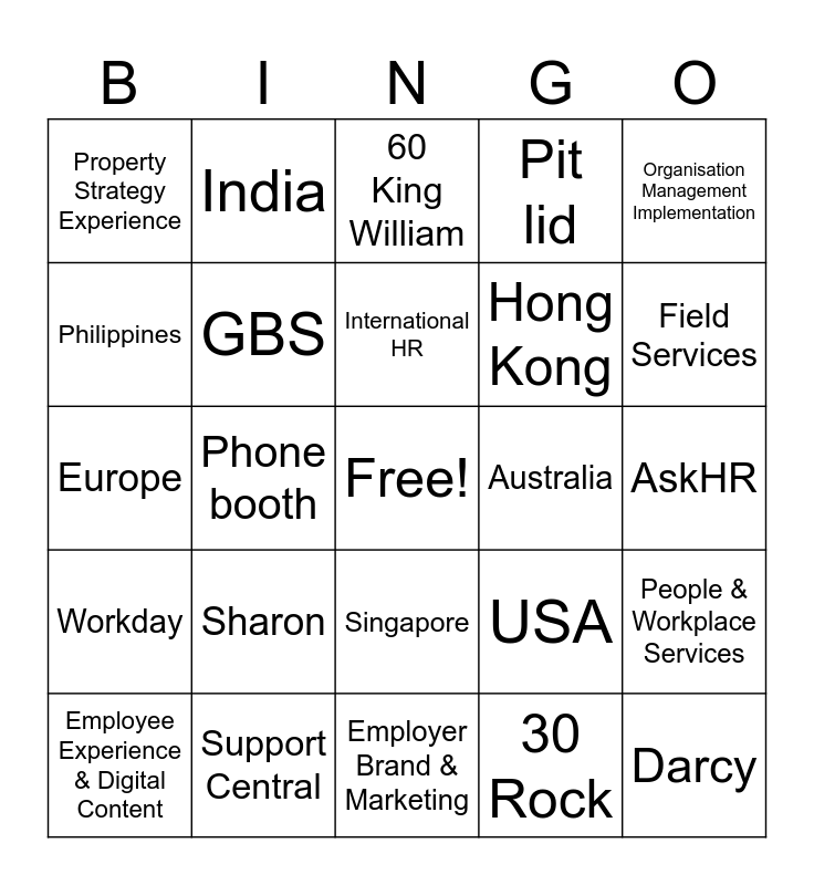 This bingo card has a free space and 25 words: Sharon, Employer Brand & Marketing, International HR, Employee Experience & Digital Content, Organisation Management Implementation, Property Strategy Experience, Philippines, India, Australia, Singapore, Hong Kong, Europe, USA, People & Workplace Services, GBS, People Solutions, AskHR, 60 King William, Field Services, Phone booth, Darcy, Support Central, Workday, Pit lid and 30 Rock.