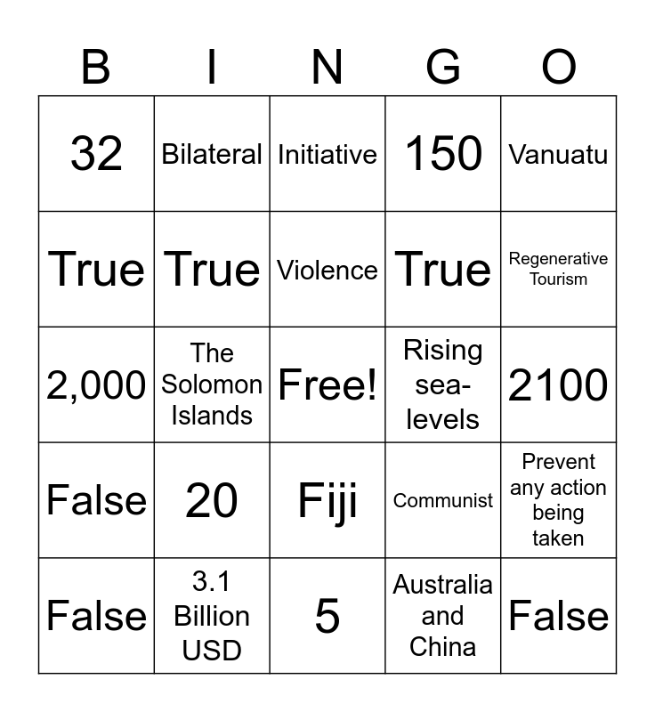 This bingo card has a free space and 25 words: 20, 5, Violence, False, Vanuatu, 32, True, Bilateral, Rising sea-levels, Fiji, True, 2,000, Communist, Prevent any action being taken, True, Education, 2100, Initiative, Regenerative Tourism, The Solomon Islands, False, 3.1 Billion USD, False, 150 and Australia and China.