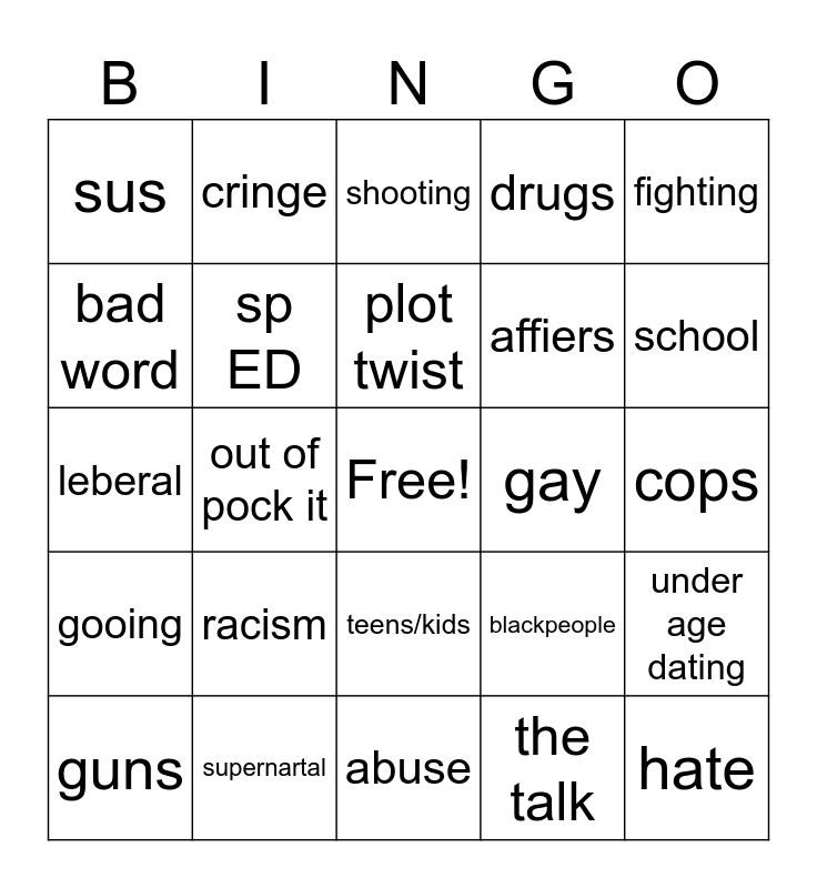 This bingo card has a free space and 24 words: racism, supernartal, plot twist, guns, fighting, sus, bad word, cringe, gay, teens/kids, affiers, leberal, blackpeople, under age dating, sp ED, the talk, cops, shooting, school, out of pock it, hate, gooing, drugs and abuse.
