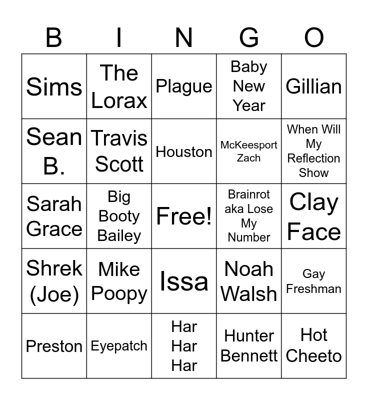 This bingo card has a free space and 29 words: Preston, Eric, Big Booty Bailey, Big T, Sims, Plague, Travis Scott, Mike Poopy, Brainrot aka Lose My Number, Eyepatch, Clay Face, Hot Cheeto, Har Har Har, Hunter Bennett, When Will My Reflection Show, Special Occassion aka Merry Christmas, Issa, Shrek (Joe), Gillian, Sarah Grace, Noah Walsh, Pirate Hat, McKeesport Zach, Sean B., Baby New Year, The Lorax, Gay Freshman, Houston and Olin aka Scooby Doo.