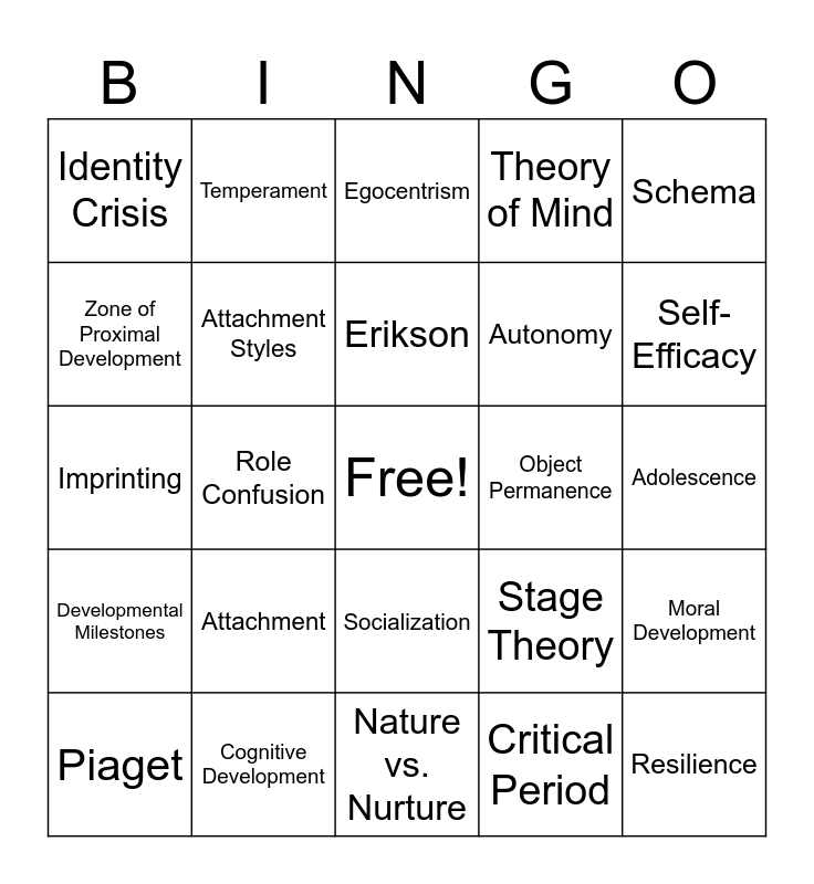 This bingo card has a free space and 24 words: Attachment, Cognitive Development, Erikson, Piaget, Schema, Identity Crisis, Zone of Proximal Development, Temperament, Object Permanence, Socialization, Autonomy, Imprinting, Stage Theory, Moral Development, Attachment Styles, Critical Period, Adolescence, Egocentrism, Self-Efficacy, Role Confusion, Resilience, Developmental Milestones, Theory of Mind and Nature vs. Nurture.