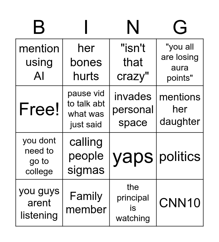 This bingo card has 16 words: Family member, politics, "isn't that crazy", mention using AI, you dont need to go to college, her bones hurts, yaps, the principal is watching, Free!, pause vid to talk abt what was just said, you guys arent listening, "you all are losing aura points", calling people sigmas, mentions her daughter, invades personal space and CNN10.