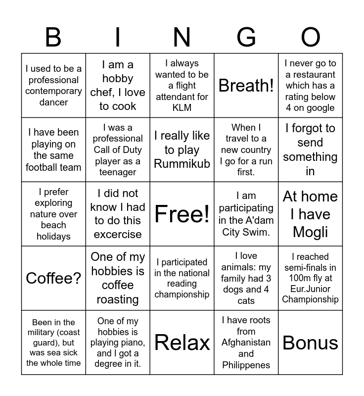 This bingo card has a free space and 24 words: One of my hobbies is coffee roasting, One of my hobbies is playing piano, and I got a degree in it., I really like to play Rummikub, Been in the military (coast guard), but was sea sick the whole time, I never go to a restaurant which has a rating below 4 on google, I used to be a professional contemporary dancer, I have been playing on the same football team, I am a hobby chef, I love to cook, I am participating in the A'dam City Swim., I participated in the national reading championship, When I travel to a new country I go for a run first., I prefer exploring nature over beach holidays, I love animals: my family had 3 dogs and 4 cats, I reached semi-finals in 100m fly at Eur.Junior Championship, I was a professional Call of Duty player as a teenager, I have roots from Afghanistan and Philippenes, At home I have Mogli, I always wanted to be a flight attendant for KLM, I forgot to send something in, I did not know I had to do this excercise, Bonus, Coffee?, Breath! and Relax.