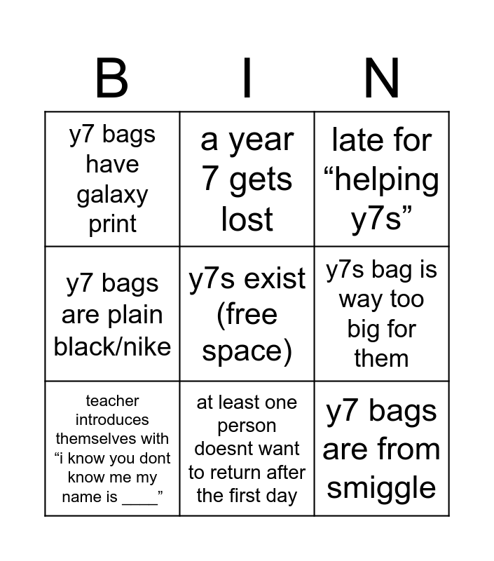 This bingo card has a free space and 8 words: y7s bag is way too big for them, late for “helping y7s”, a year 7 gets lost, teacher introduces themselves with “i know you dont know me my name is ____”, y7 bags have galaxy print, y7 bags are from smiggle, y7 bags are plain black/nike and at least one person doesnt want to return after the first day.