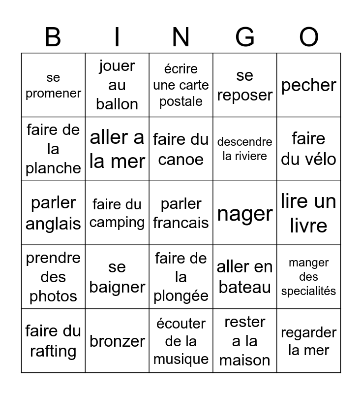 This bingo card has a free space and 24 words: se baigner, bronzer, faire du canoe, faire du rafting, pecher, se promener, faire de la planche, jouer au ballon, nager, faire de la plongée, descendre la riviere, parler anglais, aller en bateau, manger des specialités, aller a la mer, rester a la maison, lire un livre, écrire une carte postale, faire du vélo, faire du camping, regarder la mer, prendre des photos, se reposer and écouter de la musique.