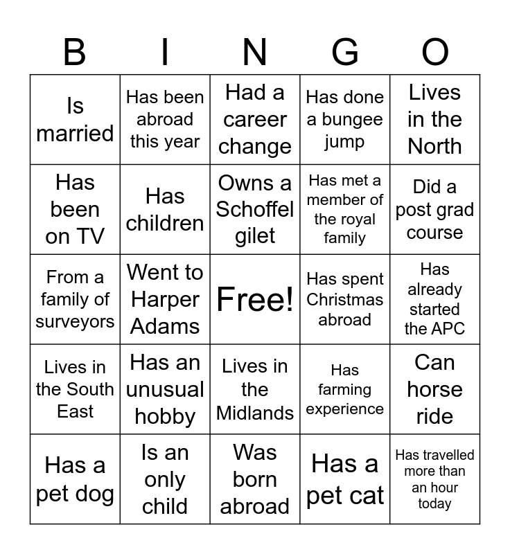 This bingo card has a free space and 29 words: Has a pet dog, Went to the RAU, Went to Harper Adams, Can play the guitar, Is married, Had a career change, Has children, Has an unusual hobby, Has spent Christmas abroad, Is an only child, Has already started the APC, Has travelled more than an hour today, Was born abroad, Has a pet cat, Did a post grad course, Lives in the South West, Lives in the Midlands, Lives in the South East, Lives in the North, From a family of surveyors, Has farming experience, Has conservation experience, Has met a member of the royal family, Has been on TV, Has done a bungee jump, Has been abroad this year, Can horse ride, Owns a Schoffel gilet and Has lived in London.