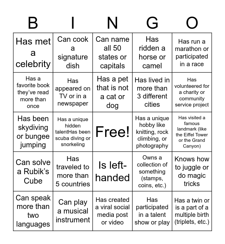 This bingo card has a free space and 24 words: Has traveled to more than 5 countries, Can play a musical instrument, Has a pet that is not a cat or dog, Can speak more than two languages, Has run a marathon or participated in a race, Has met a celebrity, Has a favorite book they’ve read more than once, Can cook a signature dish, Has a unique hobby like knitting, rock climbing, or photography, Is left-handed, Has lived in more than 3 different cities, Has been skydiving or bungee jumping, Owns a collection of something (stamps, coins, etc.), Knows how to juggle or do magic tricks, Has appeared on TV or in a newspaper, Has participated in a talent show or play, Has visited a famous landmark (like the Eiffel Tower or the Grand Canyon), Can name all 50 states or capitals, Has volunteered for a charity or community service project, Has a unique hidden talentHas been scuba diving or snorkeling, Has a twin or is a part of a multiple birth (triplets, etc.), Can solve a Rubik’s Cube, Has ridden a horse or camel and Has created a viral social media post or video.