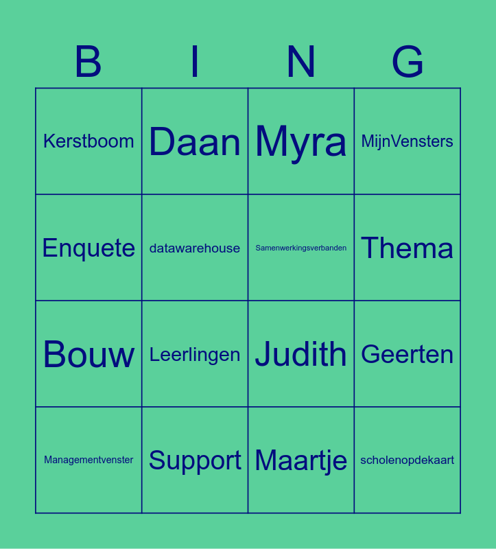 This bingo card has 59 words: Schoolgids, Analyse, Tevredenheidsonderzoek, scholenopdekaart, Schoolbesturen, Benchlearning, Samenwerkingsverbanden, Dashboard, Bouw, Onderhoud, MijnVensters, MOOI, datawarehouse, DiB, Vensters, Kerstboom, Managementvenster, Enquete, Sectorrapportage, Thema, Support, Myra, Inloggen, Encyclopedie, Workshops, Data, Analyse, Personeel, Leerlingen, Scholen, Monitor, PO-Raad, VO-raad, Alina, Daan, Esther, Evelyn, Geerten, Jill, Judith, Jurre, Lotte, Maartje, Megan, Seyma, Willem, Alina, Aviva, Bernard, Charlotte, Evelyn, Heleen, Inge, Lisanne, Lizette, Manon, Pim, Tom and Tanja.