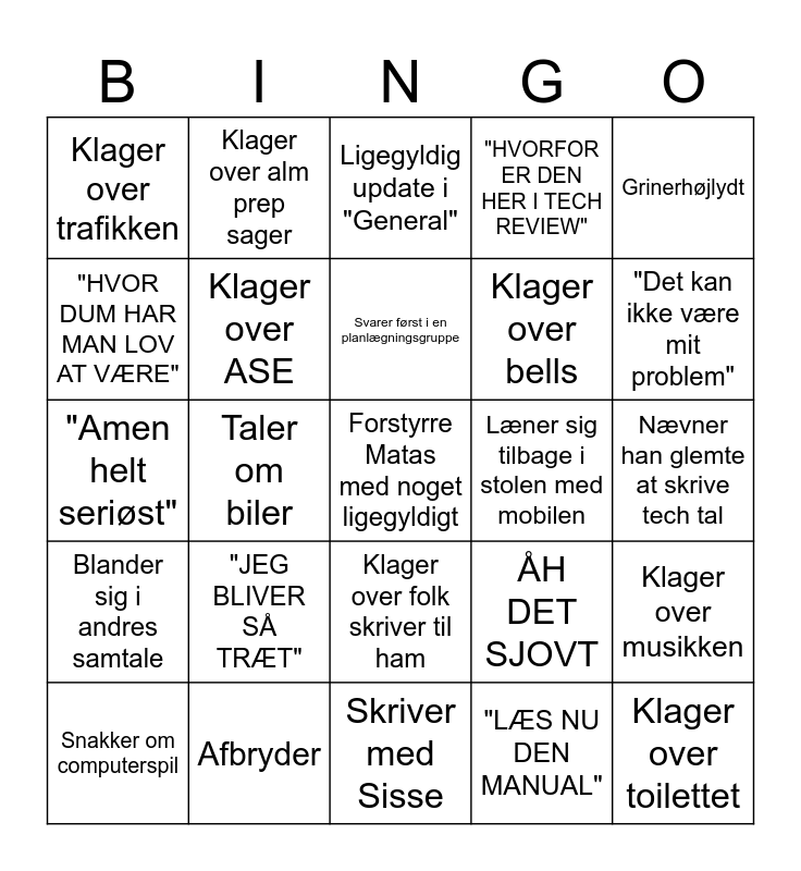 This bingo card has 25 words: "JEG BLIVER SÅ TRÆT", Skriver med Sisse, Svarer først i en planlægningsgruppe, Snakker om computerspil, Grinerhøjlydt, Klager over trafikken, "HVOR DUM HAR MAN LOV AT VÆRE", Klager over alm prep sager, Læner sig tilbage i stolen med mobilen, Klager over folk skriver til ham, Klager over bells, "Amen helt seriøst", ÅH DET SJOVT, Klager over musikken, Klager over ASE, Klager over toilettet, Nævner han glemte at skrive tech tal, Ligegyldig update i "General", "Det kan ikke være mit problem", Taler om biler, Forstyrre Matas med noget ligegyldigt, Afbryder, Blander sig i andres samtale, "HVORFOR ER DEN HER I TECH REVIEW" and "LÆS NU DEN MANUAL".