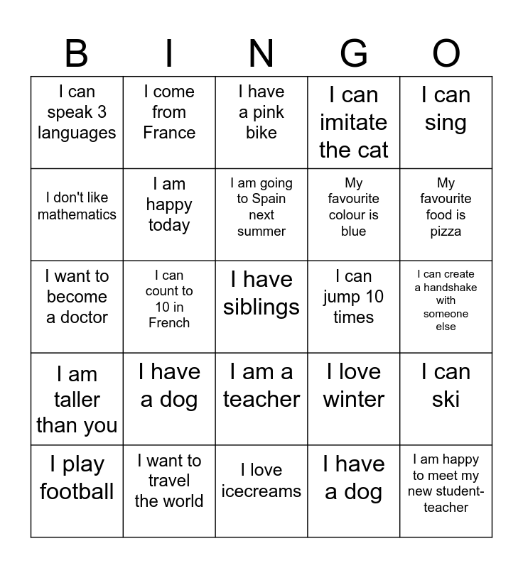 This bingo card has a free space and 25 words: I have a dog, I love icecreams, I am going to Spain next summer, I play football, I can sing, I can speak 3 languages, I don't like mathematics, I come from France, I can jump 10 times, I am a teacher, My favourite colour is blue, I want to become a doctor, I love winter, I can ski, I am happy today, I feel tired, I can create a handshake with someone else, I have a pink bike, My favourite food is pizza, I can count to 10 in French, I am happy to meet my new student-teacher, I want to travel the world, I am taller than you, I can imitate the cat and I have a dog.