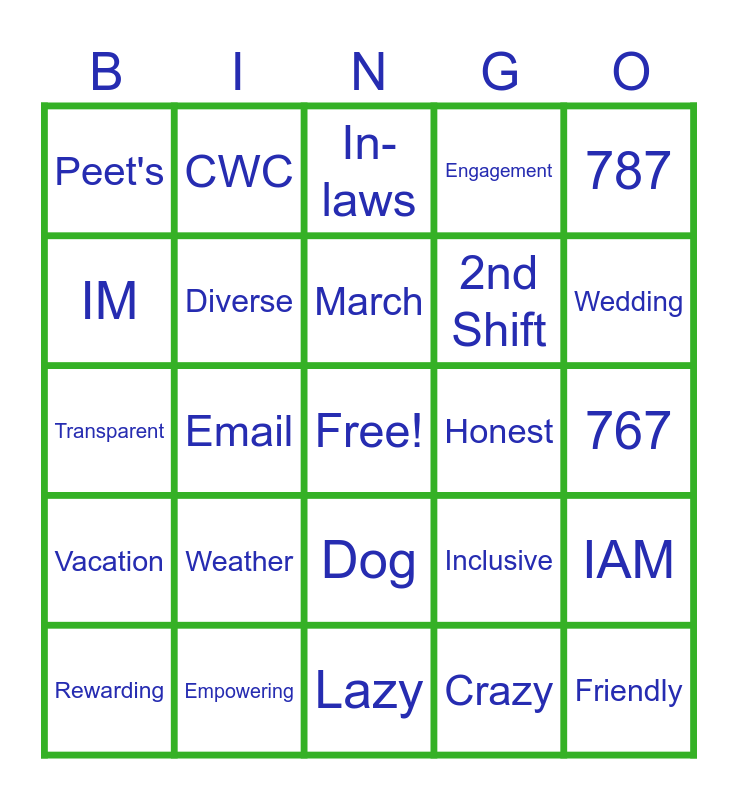 This bingo card has a free space and 65 words: 777, Jim, Coffee, IAM, SPEEA, Contract, CWC, Weekend, March, Rally, Dog, Sarah, 767, 787, Food Truck, IM, Email, Peet's, FTC, 2nd Shift, Weather, Vacation, Engagement, EDC, Resume, Office, Fun, Challenging, Friendly, Engaging, Rewarding, Collaborative, Flexible, Supportive, Inclusive, Empowering, Respectful, Transparent, Crazy, Flexible, Diverse, Grateful, Honest, Cute, Hot, Sleep, Wedding, Busy, Relaxing, Eventful, Boring, Exciting, Productive, Lazy, Negotiations, School, Kid (s), In-laws, Class, Training, Football, Seahawks, Traffic, Happy and Fall.