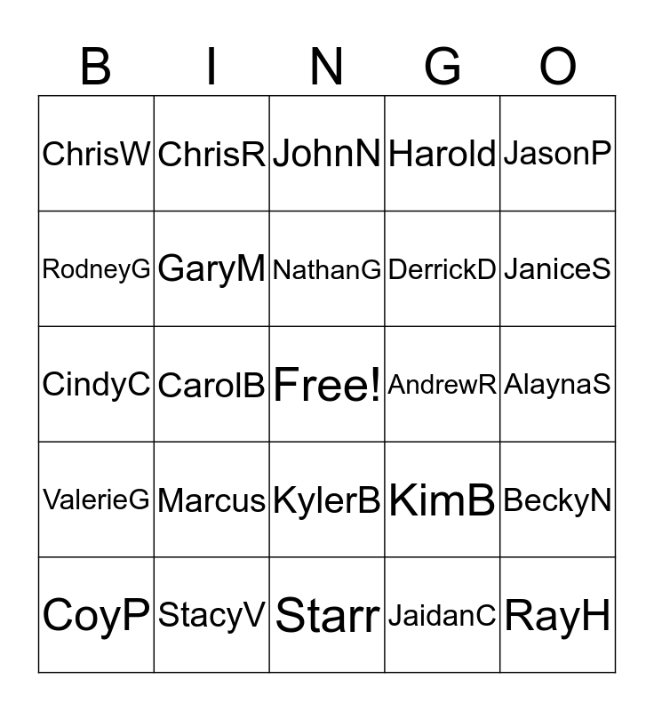 This bingo card has a free space and 151 words: AnthonyF, BlakeP, BrettB, ChaseD, ChristianC, IsaacJ, MicahF, DustinS, GaryS, MichaelA, SteveD, BruceF, DerrickD, DannyC, GaryM, RodneyG, EldonH, JimmyW, RogerS, SabastianW, ZachP BrianH DeclanB EhtanP HerbW, AlexS LauraS ScottG DavidN EverettR, FrankT MichaelS StuartM JanisC AkikoN, MorganB TroyW ChristianG DonH JeremyH, JessicaK, KimT, AaronA, AndrewR, DebbieN, DustyC, JeffM, DanielT, JonasY, JoshF, RayC, ZackP, DonnieE, MelissaY, RayH, Alan, Darla, DustyH, JasonP, JodyB, KathyK, TracyT, AlC, JerriB, ValerieG, JesseM, MitchH, ChrisW, KylerB, VictoriaO, BillyB, Courtney, Eldon, Jack, JoshG, Kenny, LindaD, LisaM, Marcus, BillW, ChrisL, ChristineP, Harold, JasonL, TylerH, BillyBo, Starr, KimB, DavidP, BrianT, EranO, JakeP, JaredE, JohnR, McKenzie, NathanG, RickS, SteveM, WilliamG, LexiF, ChrisR, DonnieEm, CoyP, JeraldB, JoshW, StanB, TravisA, Elijah, MattS, ChristinaL, StacyV, ZackJ, MichaelG, JeanaW, TiffanyJ, JonT, BobbiM, ChristineD, ConnieM, EmilyF, JacobSc, JacobSm, JosiahB, ShannonH, JoyceJ, CaitlynP, DanetteB, JamieT, PattyM, AliciaD, CassieBa, CindyC, ClintK, DianR, George, JaniceS, JohnN, KaitlynR, MargieD, PattyF, TaylorB, ToniC, AlaynaS, BeckyN, MariaH, AnnaD, JaidanC, MistyR, ChrisF, CodyW, LindyT, CarolB, JeanaL, CassieBe, MattW, ScottM, DanielL, ScottA, DebbieP, JimA, JoS, ChristynD, BradyD, ColtonL, DarrenB, JulianY and TeraW.