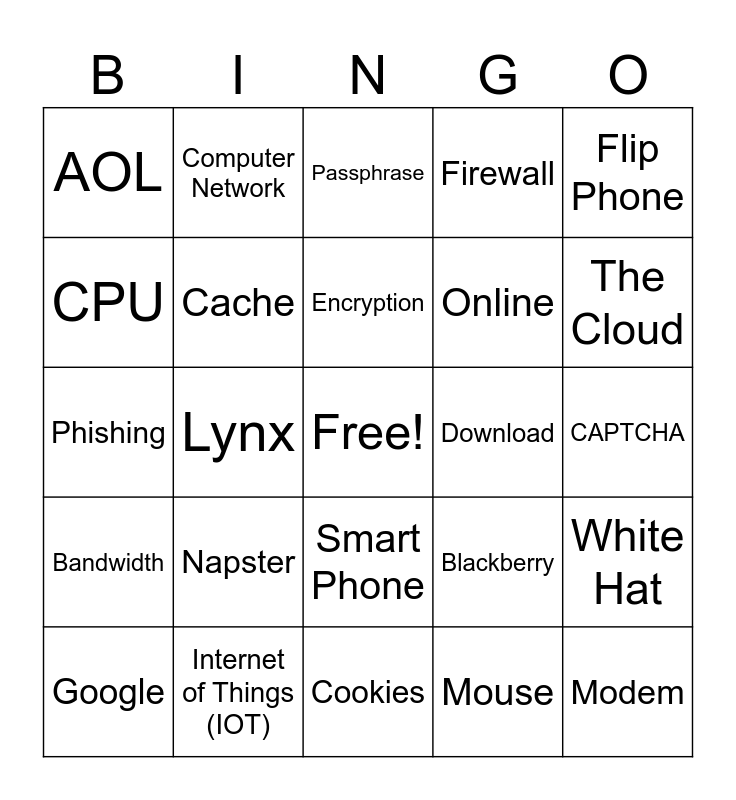 This bingo card has a free space and 73 words: Adware, Andriod, AOL, Apple IOS, ARPANET, Atari, Bandwidth, Black Hat, Blackberry, Broadband, Browser, Brute Force Attack, Cache, CAPTCHA, Chips, Computer Network, Cookies, CPU, Desktop, Download, Encryption, Firewall, Flip Phone, Gaming, Google, Hacker, Hacktivist, HP, Icon, Internet Explorer, Internet of Things (IOT), ISM, Keyloggers, Laptop, Lynx, Mac, Microprocessor, Microsoft, Modem, Monitor, Mouse, Napster, Navigation bar, Netscape, Offline, Online, Passphrase, Password, Password manager, Phishing, playstation, Port, Portal, RAM, Rootkits, Safari, Scareware, Smart Phone, Smart Watch, SPAM, Spooging, Spyware, StarTAC, The Cloud, Trojan, Updates, URL, Webmail, White Hat, World Wide Web, Worm, X-Box and Zero-day Threat.