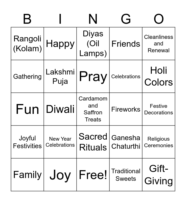 This bingo card has 31 words: Free!, Festival of Lights, Diwali, Deepavali, Rangoli (Kolam), Diyas (Oil Lamps), Lakshmi Puja, Ganesha Chaturthi, Fireworks, Traditional Sweets, Festive Decorations, Cardamom and Saffron Treats, Gift-Giving, Family Gatherings, Holi Colors, Vibrant Lanterns, Religious Ceremonies, New Year Celebrations, Joyful Festivities, Sacred Rituals, Cleanliness and Renewal, Firecracker, Family, Happy, Celebrations, Gathering, Friends, Fun, Joy, Pray and Temple.