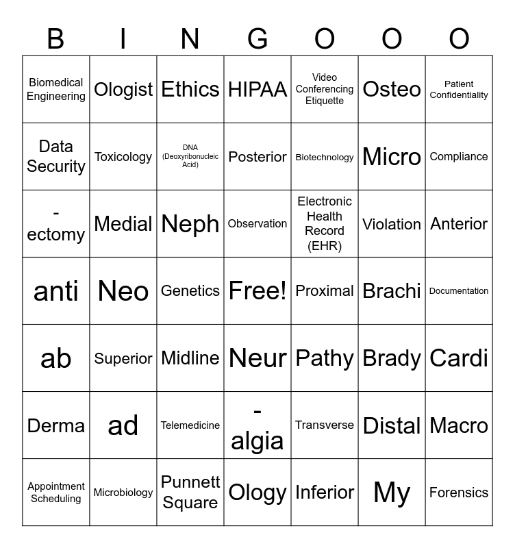 This bingo card has a free space and 50 words: Macro, Micro, My, Neo, Neph, Neur, Ologist, Ology, Osteo, Pathy, Patient Confidentiality, HIPAA, Violation, Electronic Health Record (EHR), Telemedicine, Documentation, Data Security, Compliance, Appointment Scheduling, Video Conferencing Etiquette, Biotechnology, Genetics, Biomedical Engineering, Toxicology, Microbiology, Forensics, DNA (Deoxyribonucleic Acid), Punnett Square, Ethics, Observation, a, ab, ad, -algia, anti, Brachi, Brady, Cardi, Derma, -ectomy, Midline, Transverse, Superior, Inferior, Anterior, Posterior, Proximal, Distal, Medial and Lateral.