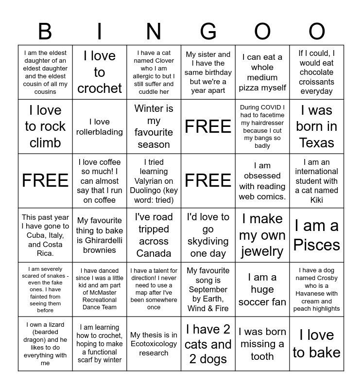 This bingo card has 36 words: My favourite song is September by Earth, Wind & Fire, I have a talent for direction! I never need to use a map after I've been somewhere once, I have 2 cats and 2 dogs, I love to rock climb, This past year I have gone to Cuba, Italy, and Costa Rica., FREE, I love rollerblading, My thesis is in Ecotoxicology research, I can eat a whole medium pizza myself, I am a huge soccer fan, I was born in Texas, My sister and I have the same birthday but we're a year apart, I have a dog named Crosby who is a Havanese with cream and peach highlights, I love coffee so much! I can almost say that I run on coffee, FREE, I am the eldest daughter of an eldest daughter and the eldest cousin of all my cousins, I am severely scared of snakes - even the fake ones. I have fainted from seeing them before, I am obsessed with reading web comics., FREE, I have a cat named Clover who I am allergic to but I still suffer and cuddle her, I tried learning Valyrian on Duolingo (key word: tried), My favourite thing to bake is Ghirardelli brownies, I'd love to go skydiving one day, I've road tripped across Canada, I make my own jewelry, I love to crochet, During COVID I had to facetime my hairdresser because I cut my bangs so badly, I am learning how to crochet, hoping to make a functional scarf by winter, Winter is my favourite season, If I could, I would eat chocolate croissants everyday, I love to bake, I own a lizard (bearded dragon) and he likes to do everything with me, I am a Pisces, I am an international student with a cat named Kiki, I have danced since I was a little kid and am part of McMaster Recreational Dance Team and I was born missing a tooth.