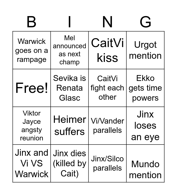 This bingo card has 16 words: Jinx dies (killed by Cait), Jinx loses an eye, CaitVi kiss, Warwick goes on a rampage, Viktor Jayce angsty reunion, Mel announced as next champ, Vi/Vander parallels, Jinx/Silco parallels, Free!, Sevika is Renata Glasc, Jinx and Vi VS Warwick, Urgot mention, Heimer suffers, Ekko gets time powers, CaitVi fight each other and Mundo mention.