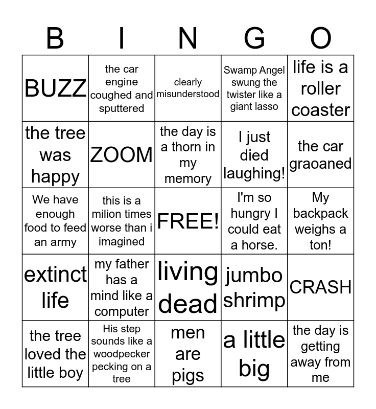 This bingo card has a free space and 24 words: my father has a mind like a computer, His step sounds like a woodpecker pecking on a tree, the day is a thorn in my memory, the tree loved the little boy, life is a roller coaster, BUZZ, the tree was happy, the car engine coughed and sputtered, I'm so hungry I could eat a horse., living dead, I just died laughing!, We have enough food to feed an army, jumbo shrimp, CRASH, ZOOM, a little big, My backpack weighs a ton!, clearly misunderstood, the car graoaned, this is a milion times worse than i imagined, the day is getting away from me, extinct life, Swamp Angel swung the twister like a giant lasso and men are pigs.