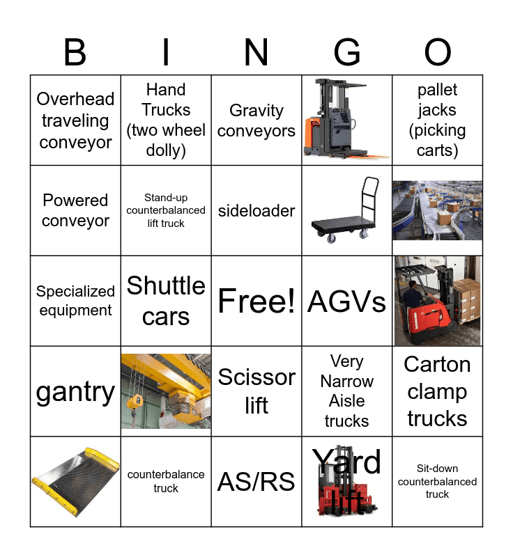 This bingo card has 7 images, a free space and 20 words: Scissor lift, Yard lift, sideloader, counterbalance truck, pallet jacks (picking carts), Overhead traveling conveyor, Powered conveyor, Hand Trucks (two wheel dolly), Very Narrow Aisle trucks, Specialized equipment, Carton clamp trucks, Shuttle cars, Overhead crane and hoist, gantry, Gravity conveyors, Sit-down counterbalanced truck, AS/RS, AGVs, Stand-up counterbalanced lift truck and Electric Pallet Trucks.
