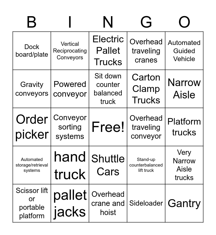 This bingo card has a free space and 24 words: hand truck, pallet jacks, Sit down counter balanced truck, Scissor lift or portable platform, Automated Guided Vehicle, Dock board/plate, Gravity conveyors, Vertical Reciprocating Conveyors, Overhead traveling conveyor, Shuttle Cars, Carton Clamp Trucks, Order picker, Stand-up counterbalanced lift truck, Very Narrow Aisle trucks, Powered conveyor, Sideloader, Platform trucks, Electric Pallet Trucks, Narrow Aisle, Conveyor sorting systems, Gantry, Automated storage/retrieval systems, Overhead traveling cranes and Overhead crane and hoist.
