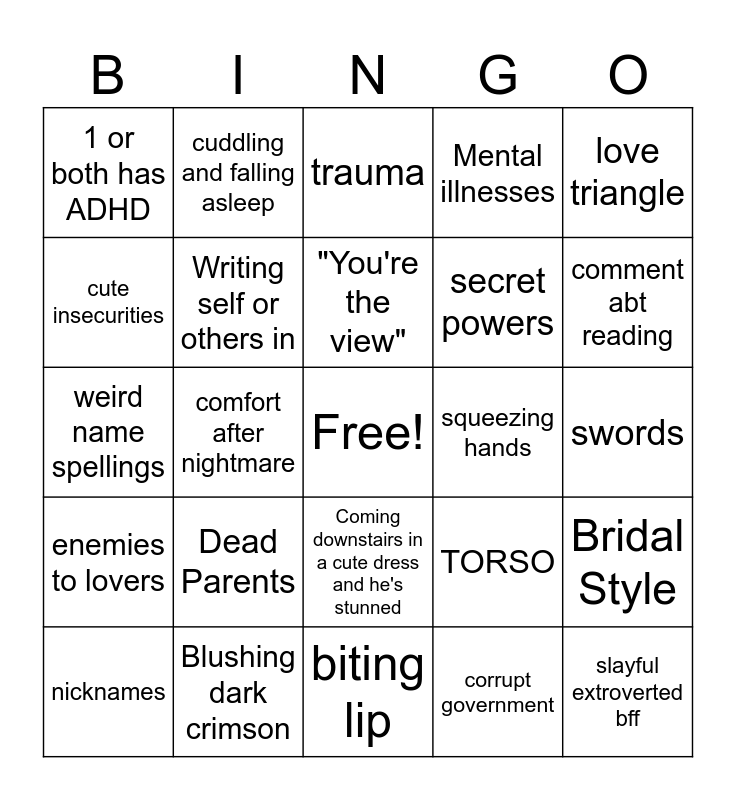 This bingo card has a free space and 24 words: Dead Parents, Blushing dark crimson, "You're the view", nicknames, love triangle, 1 or both has ADHD, cute insecurities, cuddling and falling asleep, squeezing hands, Coming downstairs in a cute dress and he's stunned, secret powers, weird name spellings, TORSO, Bridal Style, Writing self or others in, corrupt government, swords, trauma, comment abt reading, comfort after nightmare, slayful extroverted bff, enemies to lovers, Mental illnesses and biting lip.