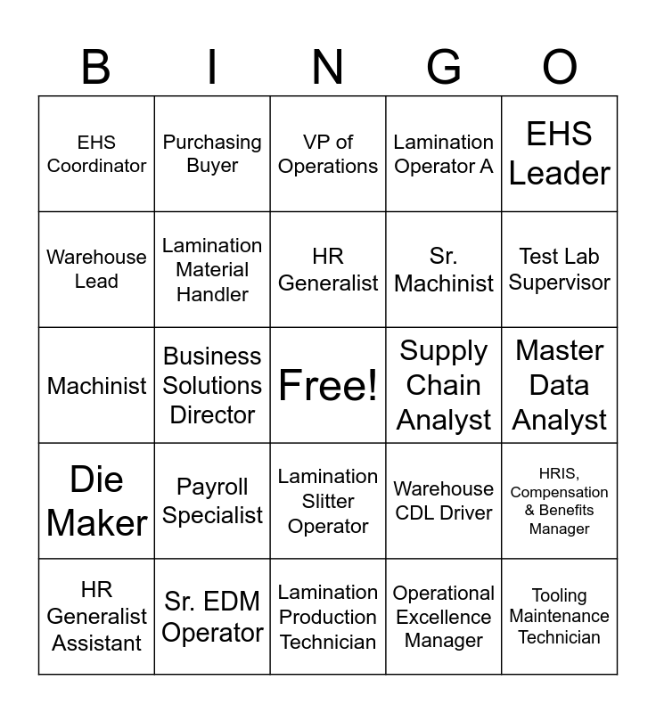 This bingo card has a free space and 97 words: Accounting Manager, Accounting Specialist, Business Analyst, Business Solutions Director, CNC Operator, Corporate Paralegal, Cost Accountant, Customer Quality Assurance Engineer, Customer Service Manager, Customer Service Representative, Demand Planner, Design Engineer, Design Programmer, Die Maker, Director of Product & Research Development, EHS Coordinator, EHS Leader, Extrusion Crew Manager, Extrusion Material Handler, Extrusion Operator A, Extrusion Operator B, Extrusion Operator C, Extrusion Production Tech Operator A+, Extrusion Supervisor, Financial Controller, HR Generalist, HR Generalist Assistant, HRIS, Compensation & Benefits Manager, Industrial Nurse & Wellness Program Leader, Lamination Crew Manager, Lamination Material Handler, Lamination Operator A, Lamination Operator B, Lamination Operator C, Lamination Production Technician, Lamination Slitter Operator, Lamination Supervisor, Lamination Wheel Maintenance Operator, Logistics Coordinator, Machinist, Maintenance Manager, Master Data Analyst, Materials Engineer, Operational Excellence Manager, Payroll Specialist, Plant Manager, President & CEO, Process Engineer, Process Technician, Product Design Engineer, Product Engineer, Product Manager, Production Scheduler, PUR Operator A, PUR Operator B, PUR Operator C, PUR Production Tech, Purchasing Buyer, Purchasing Manager, Quality Auditor, Quality Coordinator, Quality Engineer, Quality Manager, Quality Supervisor, Reclaim Operator, Scheduling Coordinator, Sr. CNC Operator, Sr. Design Programmer, Sr. Die Maker, Sr. EDM Operator, Sr. Machinist, Sr. Marketing Manager, Sr. Quality Specialist, Sr. Reclaim Operator, Sr. Testing Technician, Sr. Tooling Maintenance Technician, Staffing & Recruiting Specialist, Strategic HR Manager, Supply Chain Analyst, Supply Chain Manager, Technical Support Engineer, Test Lab Supervisor, Testing Technician, Tool Maintenance Supervisor, Tool Room Manager, Tool Room Supervisor, Tooling Maintenance Technician, Training Coordinator, VP of Finance, VP of Human Resources, VP of Operations, VP of Sales & Marketing, Warehouse Associate, Warehouse CDL Driver, Warehouse Lead, Warehouse Manager and Warehouse Supervisor.