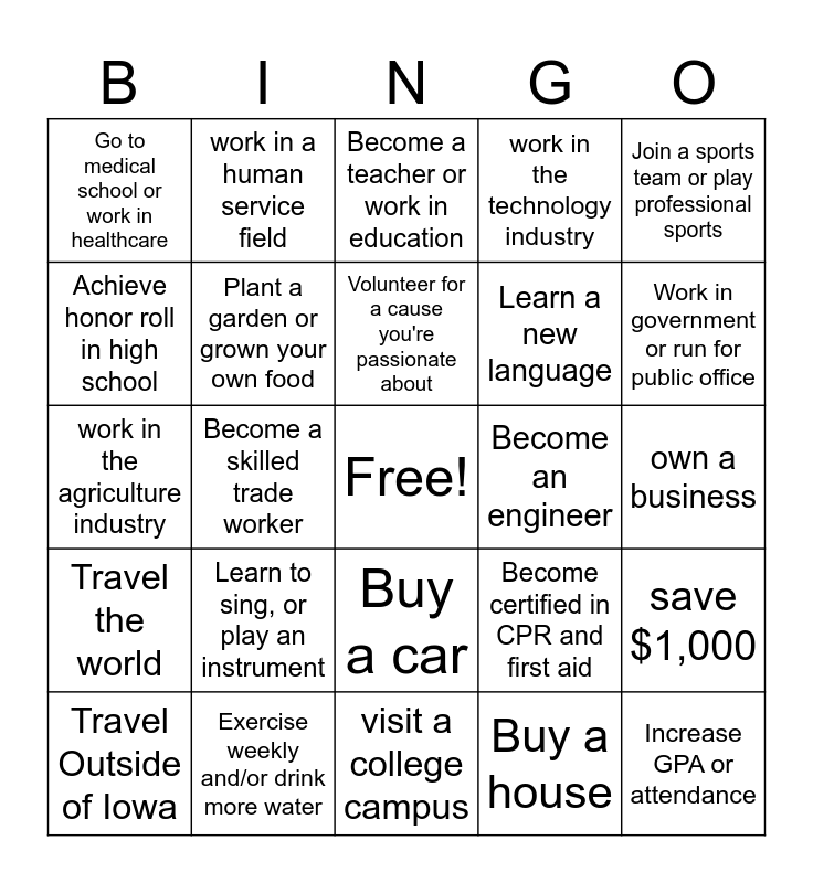 This bingo card has a free space and 24 words: Travel Outside of Iowa, Learn to sing, or play an instrument, Volunteer for a cause you're passionate about, Buy a house, Join a sports team or play professional sports, Go to medical school or work in healthcare, work in a human service field, Become a teacher or work in education, Become an engineer, own a business, work in the agriculture industry, Plant a garden or grown your own food, Become certified in CPR and first aid, save $1,000, Achieve honor roll in high school, Exercise weekly and/or drink more water, visit a college campus, work in the technology industry, Work in government or run for public office, Travel the world, Become a skilled trade worker, Buy a car, Learn a new language and Increase GPA or attendance.