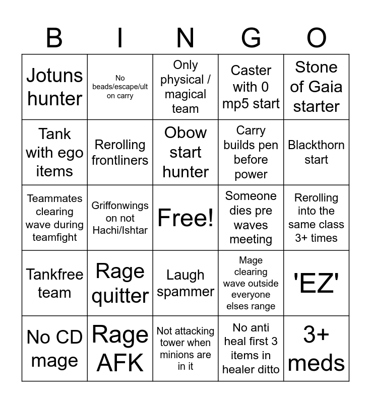 This bingo card has a free space and 24 words: Rage quitter, Rage AFK, Obow start hunter, No CD mage, Stone of Gaia starter, Jotuns hunter, Tank with ego items, No beads/escape/ult on carry, Someone dies pre waves meeting, Laugh spammer, Carry builds pen before power, Teammates clearing wave during teamfight, Mage clearing wave outside everyone elses range, 'EZ', Rerolling frontliners, No anti heal first 3 items in healer ditto, Rerolling into the same class 3+ times, Only physical / magical team, Blackthorn start, Griffonwings on not Hachi/Ishtar, 3+ meds, Tankfree team, Caster with 0 mp5 start and Not attacking tower when minions are in it.