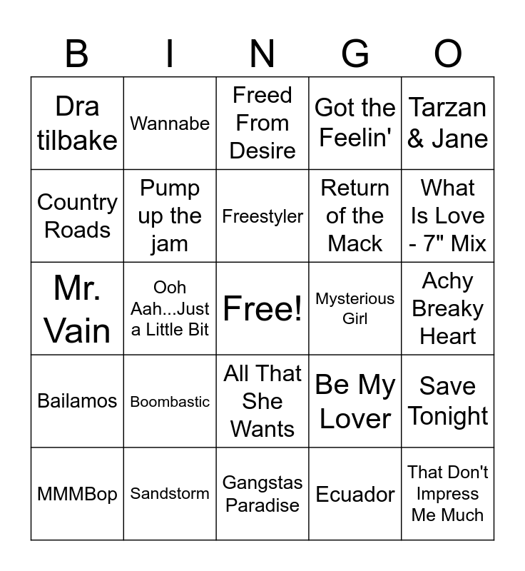 This bingo card has a free space and 90 words: Bye Bye Bye, No Limit, All That She Wants, Don't Give Me Your Life, Better Off Alone, Never Ever, I Swear, 2 Times, Barbie Girl, 9 PM - Till I come, C'est La Vie, I Want It That Way, Samba de Janeiro, Achy Breaky Heart, The bad touch, Freestyler, Picture Of You, (You Drive Me) Crazy, Gonna Make You Sweat, Believe, Genie In a Bottle, Tubthumping, Gangstas Paradise, The Rhythm of the Night, Mr. Vain, Sandstorm, Enjoy the Silence, Shy Guy, I'll Be Missing You, Heaven, It's My Life, Save Tonight, Blue, Bailamos, Dra tilbake, Got the Feelin', Freed From Desire, L'amour Toujours, Ooh Aah...Just a Little Bit, What Is Love - 7" Mix, MMMBop, Country Roads, Sweat (A La La La La Long), Summer Air, Waiting for Tonight, Be My Lover, The ketchup song, Steal My Sunshine, Unforgivable Sinner, Macarena, Mambo No. 5 (a Little Bit of...), Return of the Mack, U Can't Touch This, Coco Jamboo, Dragostea din tei, Trust me, Mysterious Girl, The Summer Is Magic, Ghetto Supastar, Another Night, Blue, Livin' la Vida Loca, I'm Too Sexy, Children, Show Me Love, Show Me Love, It Must Have Been Love, Ecuador, Scatman (ski-ba-bop-ba-dop-bop), How much is the fish, Boombastic, That Don't Impress Me Much, Rhythm Is a Dancer, Mirror Mirror, Wannabe, Pump up the jam, Forelska i lærern, Boom Boom Boom, Feel It, Life Is A Highway, Africa, Tarzan & Jane, Free, The Key, The Secret, Boom, Boom, Boom, Boom!!, King of My Castle, Love Is All Around, I wanna dance with somebody, Men In Black and The fox.