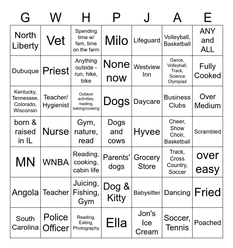 This bingo card has 52 words: South Carolina, Teacher/ Hygienist, Juicing, Fishing, Gym, Dogs and cows, Lifeguard, Track, Cross Country, Soccer, ANY and ALL, Beaver Falls, Charleston, West Memphis, Centralia, Chicago, Priest, Reading, cooking, cabin life, None now, Hyvee, Business Clubs, Scrambled, MN, Police Officer, Spending time w/ fam, time on the farm, Dogs, Jon's Ice Cream, Volleyball, Basketball, Fully Cooked, born & raised in IL, Vet, Anything outside - run, hike, bike, Ella, Westview Inn, Cheer, Show Choir, Basketball, Poached, Dubuque, Teacher, Church, Milo, Babysitter, Soccer, Tennis, over easy, North Liberty, WNBA, Gym, nature, read, Dog & Kitty, Grocery Store, Dancing, Over Medium, Kentucky, Tennessee, Colorado, Wisconsin, Teacher/ Hair Dresser, Outdoor activities, reading, baking/cooking, Parents' dogs, Daycare, Dance, Volleyball, Track, Science Olympiad, Fried, Angola, Nurse and Reading, Eating, Photography.