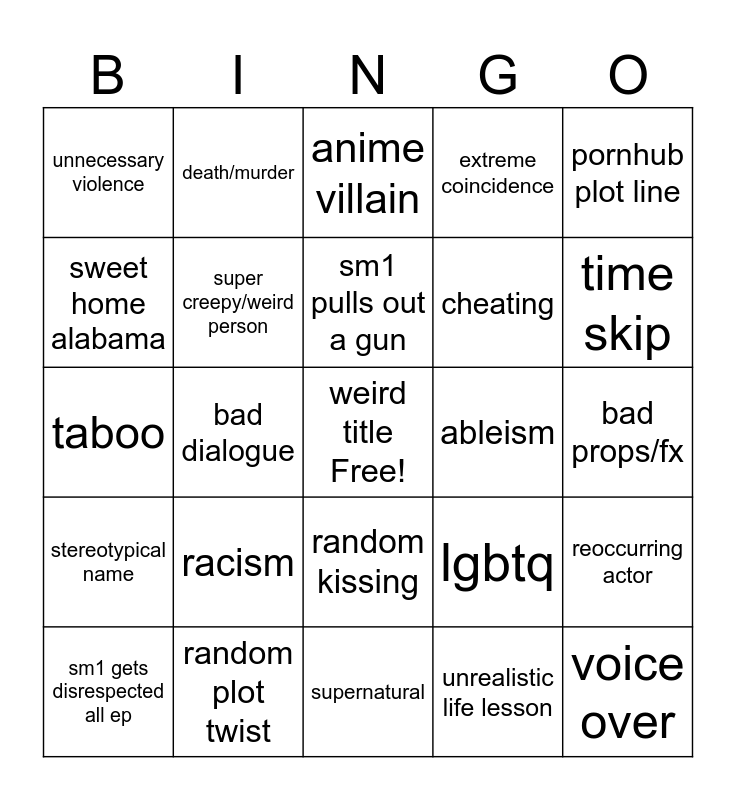 This bingo card has a free space and 24 words: racism, random plot twist, sm1 pulls out a gun, sm1 gets disrespected all ep, pornhub plot line, unnecessary violence, sweet home alabama, death/murder, ableism, random kissing, cheating, taboo, lgbtq, reoccurring actor, super creepy/weird person, unrealistic life lesson, bad props/fx, anime villain, time skip, bad dialogue, voice over, stereotypical name, extreme coincidence and supernatural.