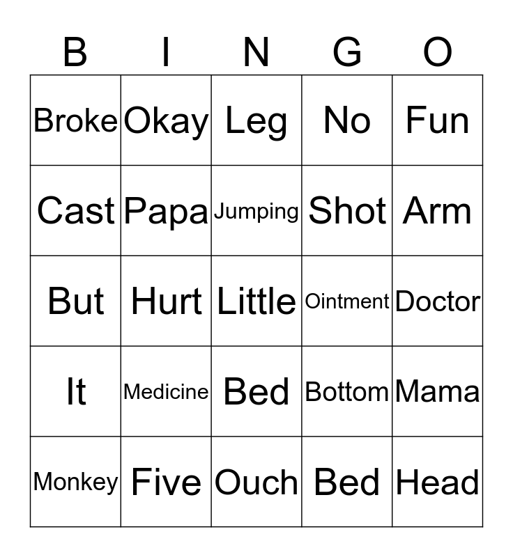 This bingo card has 25 words: Medicine, Ouch, Jumping, Monkey, Fun, Broke, Cast, Okay, Ointment, Bed, Shot, But, Bottom, Mama, Papa, Head, Doctor, Leg, Arm, Hurt, Little, Five, It, No and Bed.
