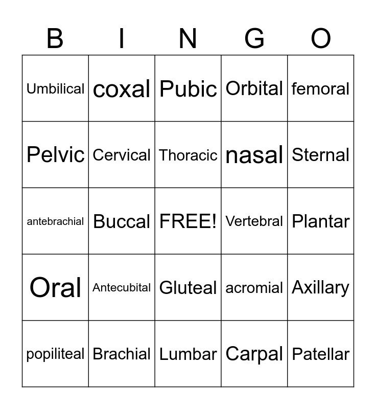 This bingo card has a free space and 24 words: Antecubital, Brachial, Thoracic, popiliteal, femoral, Umbilical, Pelvic, coxal, Vertebral, Gluteal, nasal, antebrachial, acromial, Axillary, Cervical, Carpal, Plantar, Pubic, Sternal, Buccal, Patellar, Oral, Orbital and Lumbar.