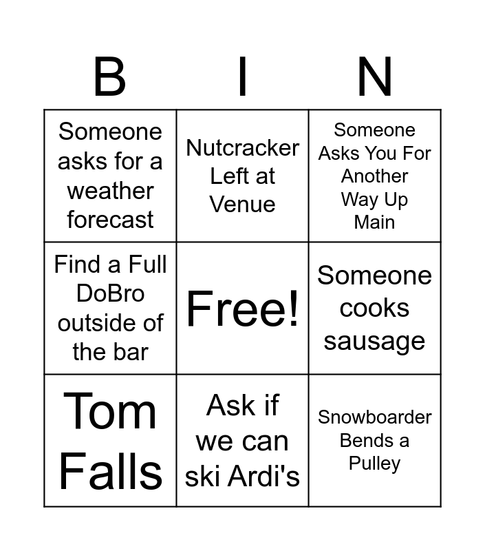 This bingo card has a free space and 9 words: Tom Falls, Someone Asks You For Another Way Up Main, Nutcracker Left at Venue, Find a Full DoBro outside of the bar, Someone asks for a weather forecast, Someone cooks sausage, Snowboarder Bends a Pulley, Someone tells you they are sponsored and Ask if we can ski Ardi's.