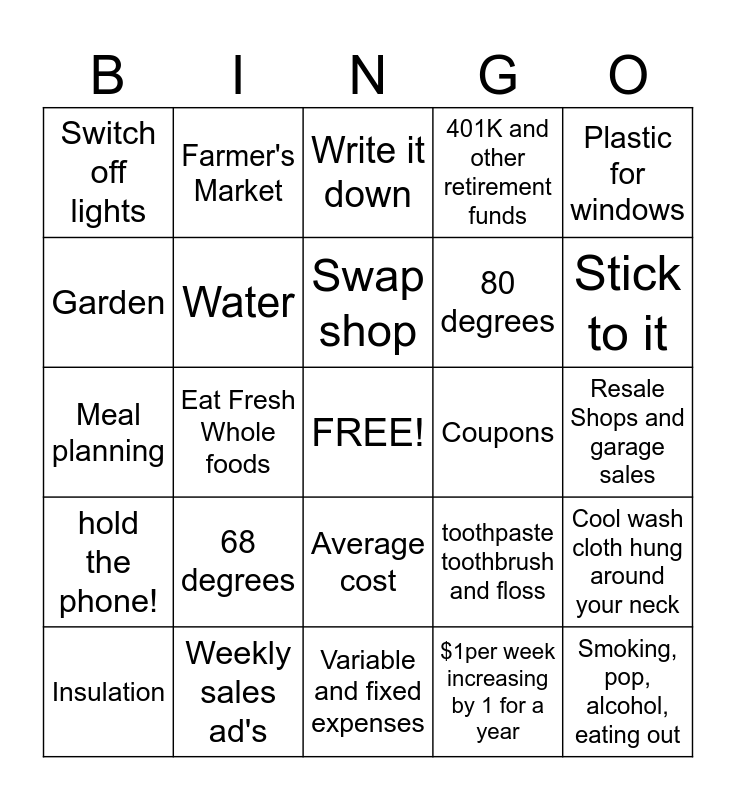 This bingo card has a free space and 24 words: 68 degrees, Weekly sales ad's, Swap shop, Insulation, Plastic for windows, Switch off lights, Garden, Farmer's Market, Coupons, Average cost, 80 degrees, Meal planning, toothpaste toothbrush and floss, Cool wash cloth hung around your neck, Water, $1per week increasing by 1 for a year, Resale Shops and garage sales, Write it down, Stick to it, Eat Fresh Whole foods, Smoking, pop, alcohol, eating out, hold the phone!, 401K and other retirement funds and Variable and fixed expenses.
