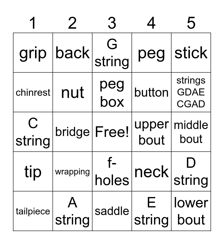 This bingo card has a free space and 39 words: hair, screw, scroll, nut, tailpiece, f-holes, peg box, frog, stick, tip, bridge, peg, lower bout, middle bout, upper bout, wrapping, pad, grip, body, neck, chinrest, saddle, button, strings GDAE CGAD, rib, fingerboard, waist, sound post, purfing, back, sides, "eye" of the scroll, G string, A string, E string, fine tuners, D string, C string and shoulder rest.
