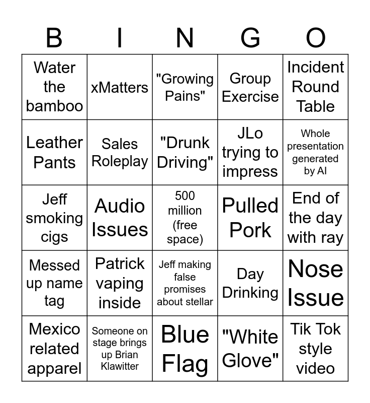 This bingo card has a free space and 24 words: Patrick vaping inside, Someone on stage brings up Brian Klawitter, "Drunk Driving", Mexico related apparel, Incident Round Table, Water the bamboo, Leather Pants, xMatters, Pulled Pork, Jeff making false promises about stellar, JLo trying to impress, Jeff smoking cigs, Day Drinking, Nose Issue, Sales Roleplay, "White Glove", End of the day with ray, "Growing Pains", Whole presentation generated by AI, Audio Issues, Tik Tok style video, Messed up name tag, Group Exercise and Blue Flag.