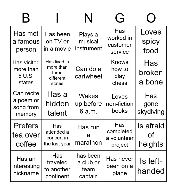 This bingo card has 30 words: Has traveled to another continent, Speaks more than one language, Has a hidden talent, Is the youngest sibling, Has met a famous person, Plays a musical instrument, Has lived in more than three different states, Has run a marathon, Loves non-fiction books, has been a club or team captain, Has gone skydiving, Wakes up before 6 a.m., Has never been on a plane, Is left-handed, Has broken a bone, Knows how to juggle, Has completed a volunteer project, Prefers tea over coffee, Has attended a concert in the last year, Loves spicy food, Can recite a poem or song from memory, Has a collection of something unusual, Has been on TV or in a movie, Knows how to play chess, Has visited more than 5 U.S. states, Has worked in customer service, Is afraid of heights, Has an interesting nickname, Can do a cartwheel and Has a favorite quote from a leadership book.