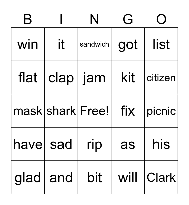 This bingo card has a free space and 25 words: sad, bit, jam, glad, list, win, flat, it, fix, rip, kit, mask, as, his, clap, chip, picnic, sandwich, citizen, shark, Clark, and, have, got and will.