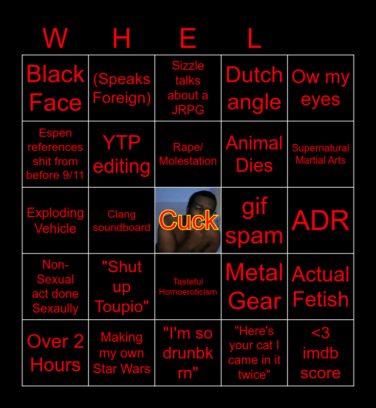 This bingo card has a free space and 24 words: "Shut up Toupio", Making my own Star Wars, Rape/ Molestation, Over 2 Hours, Ow my eyes, Black Face, Espen references shit from before 9/11, (Speaks Foreign), gif spam, Tasteful Homoeroticism, Animal Dies, Exploding Vehicle, Metal Gear, Actual Fetish, YTP editing, "Here's your cat I came in it twice", ADR, Sizzle talks about a JRPG, Supernatural Martial Arts, Clang soundboard, <3 imdb score, Non-Sexual act done Sexaully, Dutch angle and "I'm so drunbk rn".