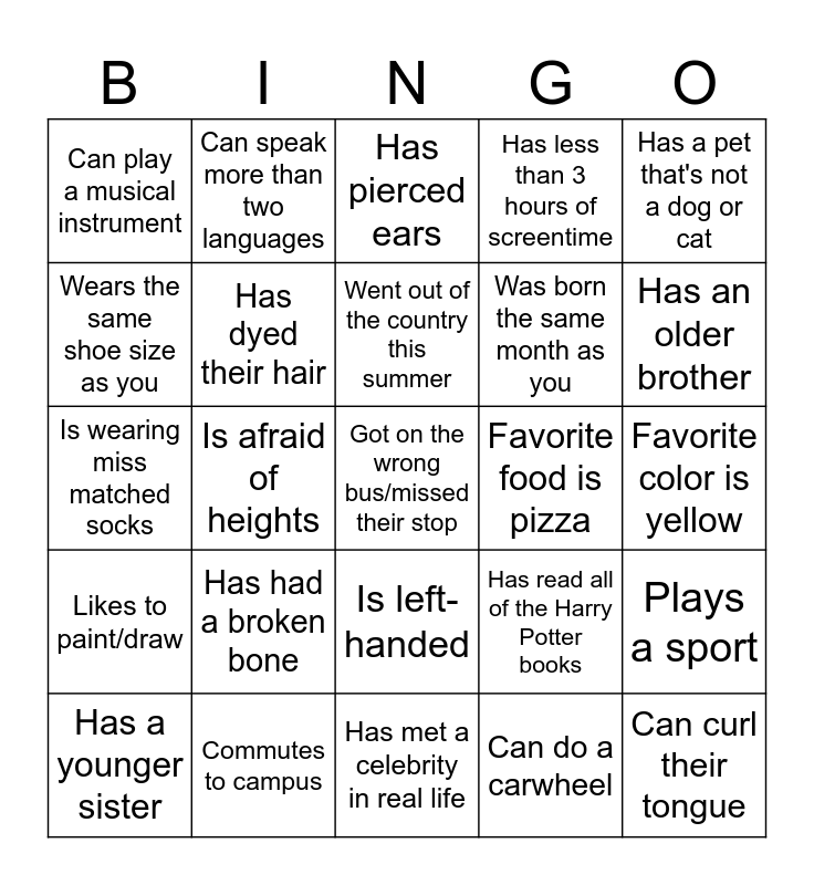 This bingo card has a free space and 24 words: Has had a broken bone, Commutes to campus, Went out of the country this summer, Has a younger sister, Has a pet that's not a dog or cat, Can play a musical instrument, Wears the same shoe size as you, Can speak more than two languages, Favorite food is pizza, Is left-handed, Was born the same month as you, Is wearing miss matched socks, Has read all of the Harry Potter books, Plays a sport, Has dyed their hair, Can do a carwheel, Favorite color is yellow, Has pierced ears, Has an older brother, Is afraid of heights, Can curl their tongue, Likes to paint/draw, Has less than 3 hours of screentime and Has met a celebrity in real life.