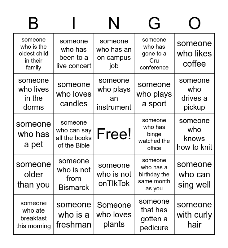 This bingo card has a free space and 24 words: someone who is not from Bismarck, someone who is a freshman, someone who plays an instrument, someone who ate breakfast this morning, someone who likes coffee, someone who is the oldest child in their family, someone who lives in the dorms, someone who has been to a live concert, someone who has binge watched the office, someone who is not onTIkTok, someone who plays a sport, someone who has a pet, someone who has a birthday the same month as you, someone who can sing well, someone who loves candles, someone that has gotten a pedicure, someone who knows how to knit, someone who has an on campus job, someone who drives a pickup, someone who can say all the books of the Bible, someone with curly hair, someone older than you, someone who has gone to a Cru conference and Someone who loves plants.