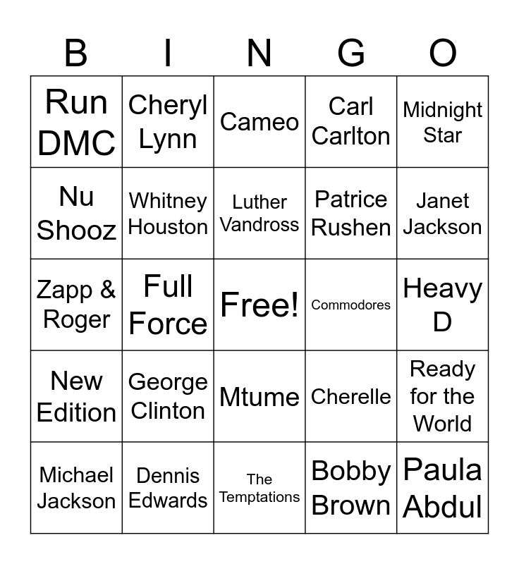 This bingo card has a free space and 27 words: Cherelle, The Whispers, Patrice Rushen, The Temptations, Nu Shooz, Cameo, Cheryl Lynn, New Edition, Commodores, Ready for the World, Zapp & Roger, Carl Carlton, Michael Jackson, Dennis Edwards, Janet Jackson, Junior, Whitney Houston, Luther Vandross, George Clinton, Run DMC, Heavy D, Bobby Brown, Full Force, Paula Abdul, Mtume, Midnight Star and Shalamar.