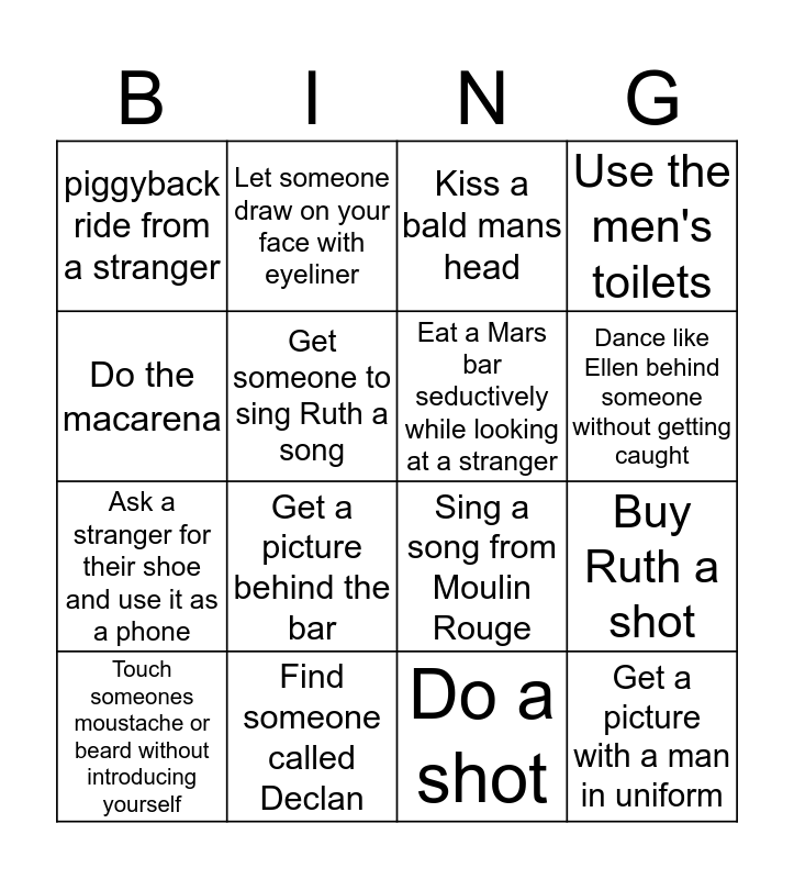 This bingo card has 16 words: Find someone called Declan, Buy Ruth a shot, Kiss a bald mans head, piggyback ride from a stranger, Ask a stranger for their shoe and use it as a phone, Let someone draw on your face with eyeliner, Sing a song from Moulin Rouge, Do a shot, Do the macarena, Get someone to sing Ruth a song, Touch someones moustache or beard without introducing yourself, Use the men's toilets, Get a picture behind the bar, Dance like Ellen behind someone without getting caught, Eat a Mars bar seductively while looking at a stranger and Get a picture with a man in uniform.